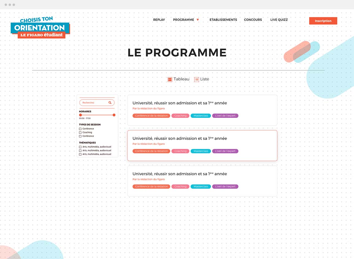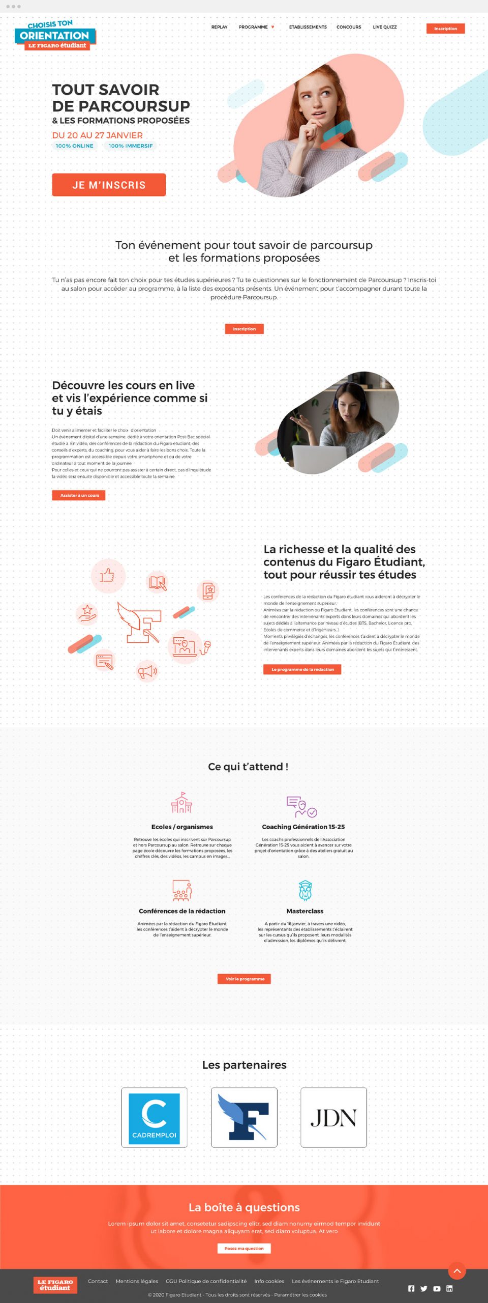 Afin de l’aider à faire le bon choix, les équipes du Figaro Étudiant ont créé Les Rencontres de l’Orientation du Figaro Étudiant, événements pluridisciplinaires, présents dans diverses villes de France. Au programme : écoles, entreprises, conférences, ateliers et coachings afin d’aider les lycéens et étudiants à construire et consolider leur projet de formation.